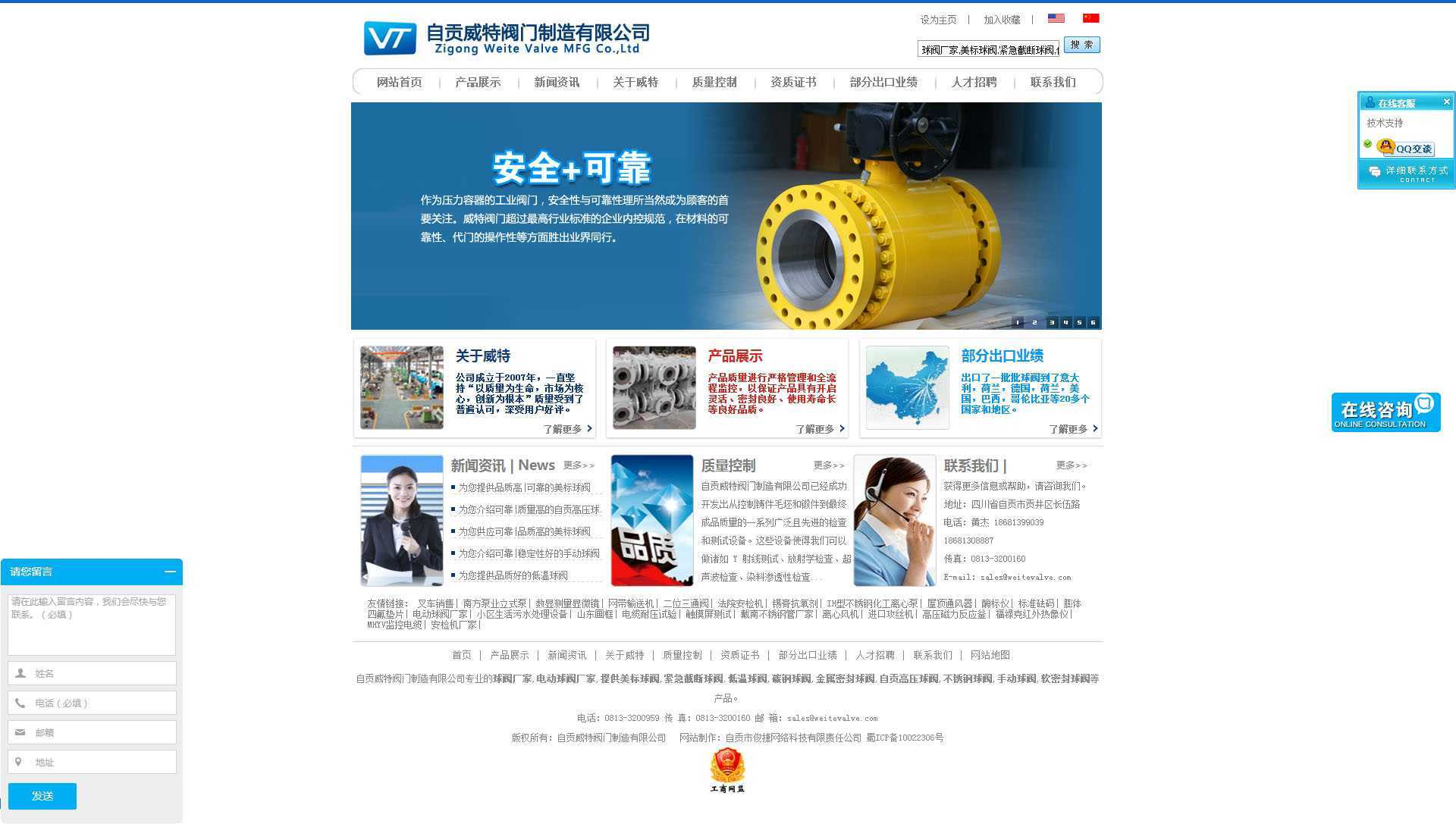 自贡威特阀门制造有限公司是一家集设计开发、制造、销售于一体的专业球阀生产企业。公司成立于2007年,自成立以来,公司一直坚持“以质量为生命,市场为核心,创新为根本”,出口了一批批球阀到了意大利,荷兰,德国,荷兰,美国,巴西,哥伦比亚,阿根廷,新加坡,泰国,印尼,越南等20多个国家和地区,质量受到了普遍认可,深受用户好评,促进了公司的快速发展。